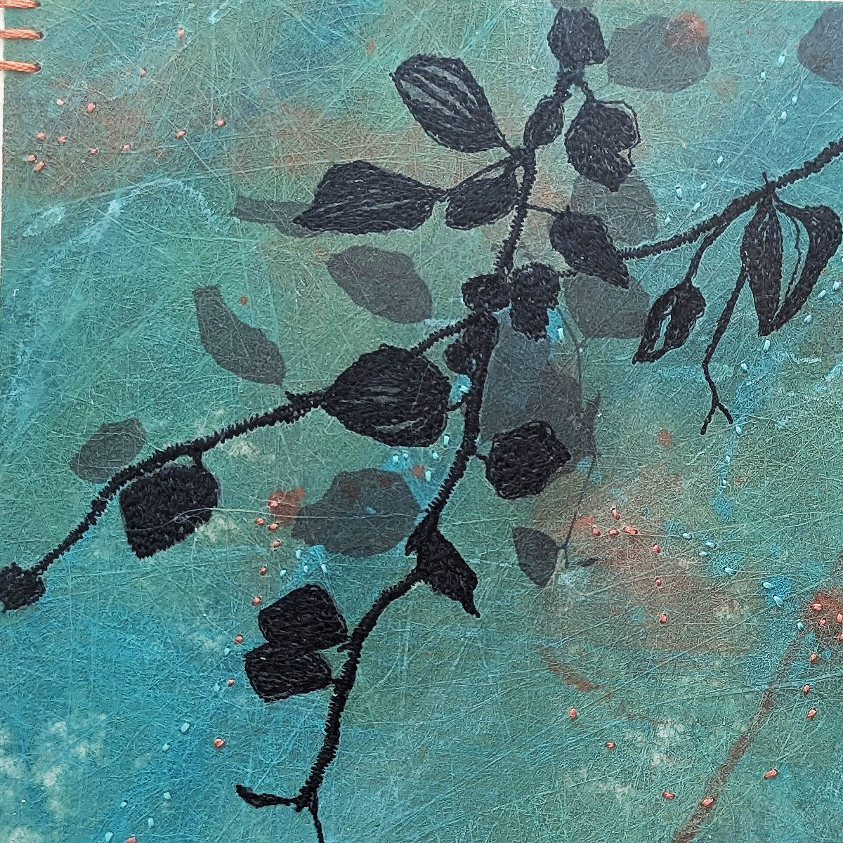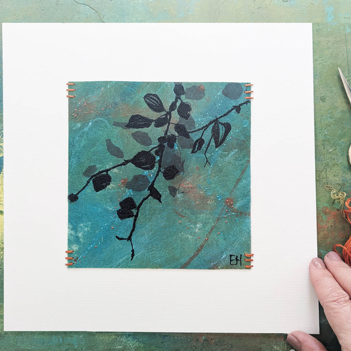 Autumn Branches captures the richness of the season through abstract painted surfaces, layered with digital prints taken from my own photographs. Â Machine embroidery traces the silhouettes of branches, while delicate hand stitching brings a sense of movement, as if a gentle breeze stirs the leaves.