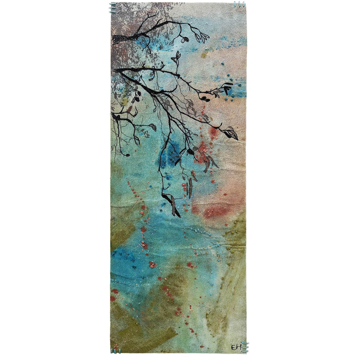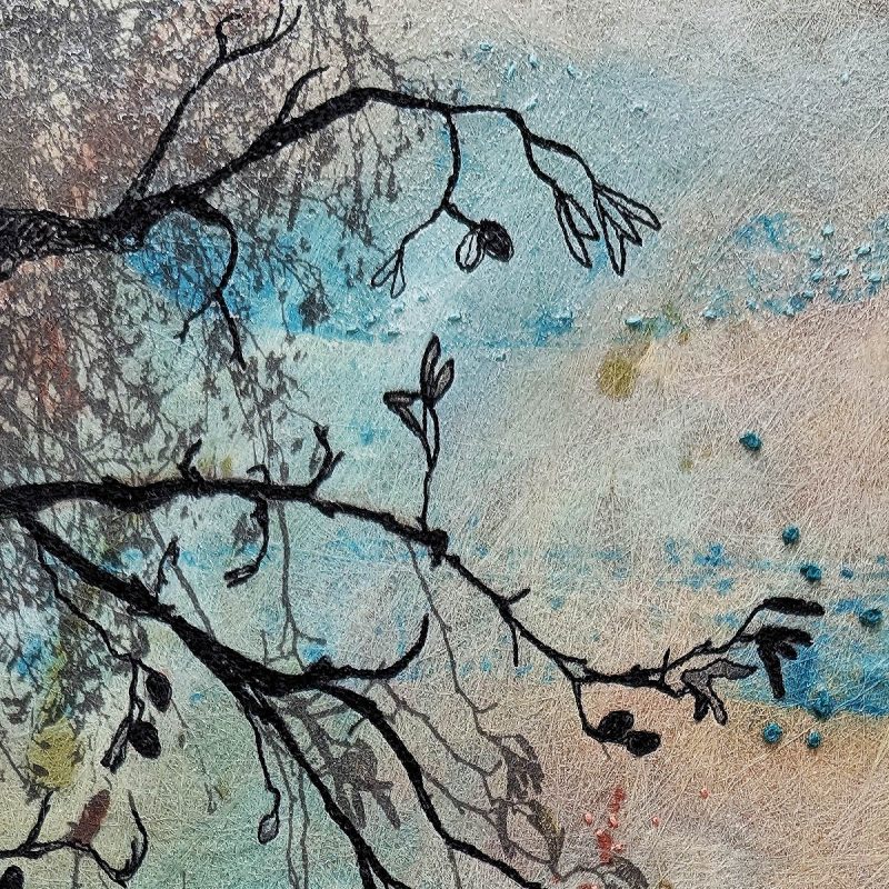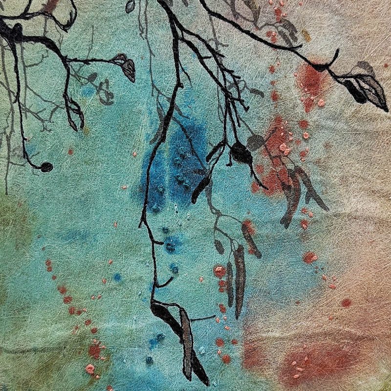 ‘Light Through the Leaves’ captures the richness of the season through abstract painted surfaces, layered with digital prints taken from my own photographs. Machine embroidery traces the silhouettes of branches, while delicate hand stitching brings a sense of movement, as if a gentle breeze stirs the leaves.
