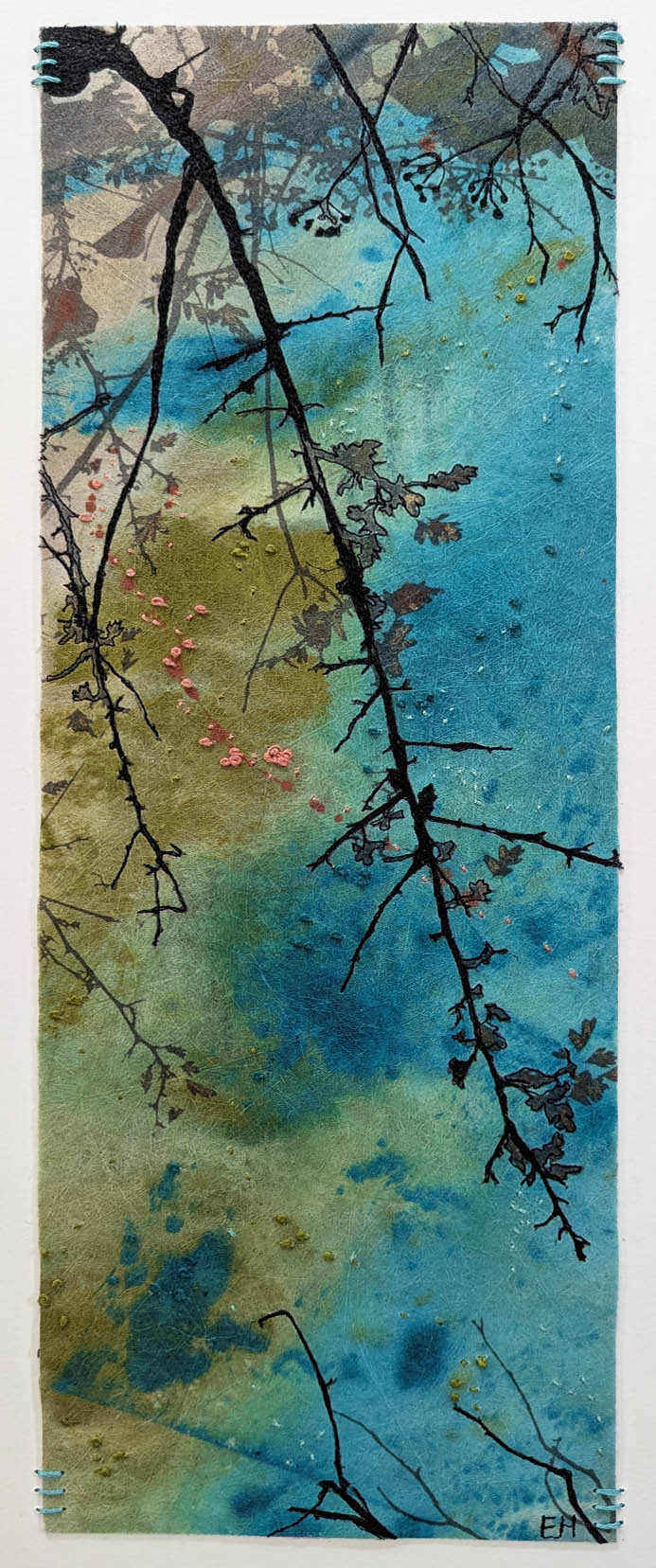 ‘Winter light’ is painted on heavy Lutradur fabric, whose delicate, lacy weave creates a soft, ethereal contrast to traditional canvas. Layered with a digital print made from my own photography, the piece captures fleeting moments of seasonal change.