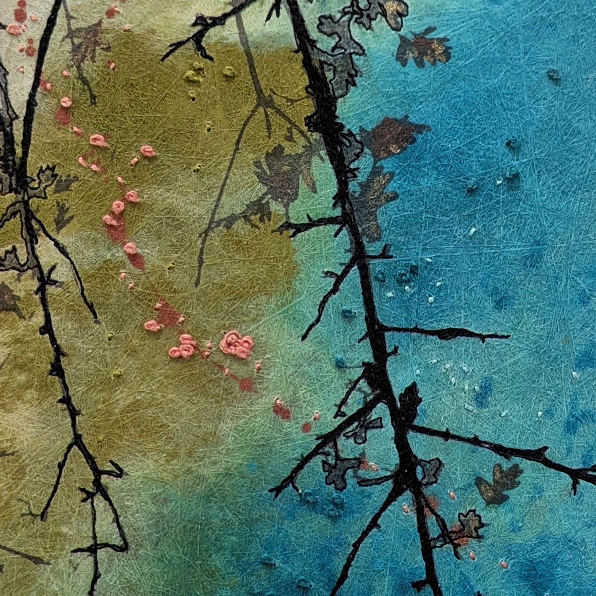 Free-motion embroidery traces the fine structure of the branches, while hand stitching highlights the negative spaces between them — reflecting the intricate, shifting beauty of the canopy above.
